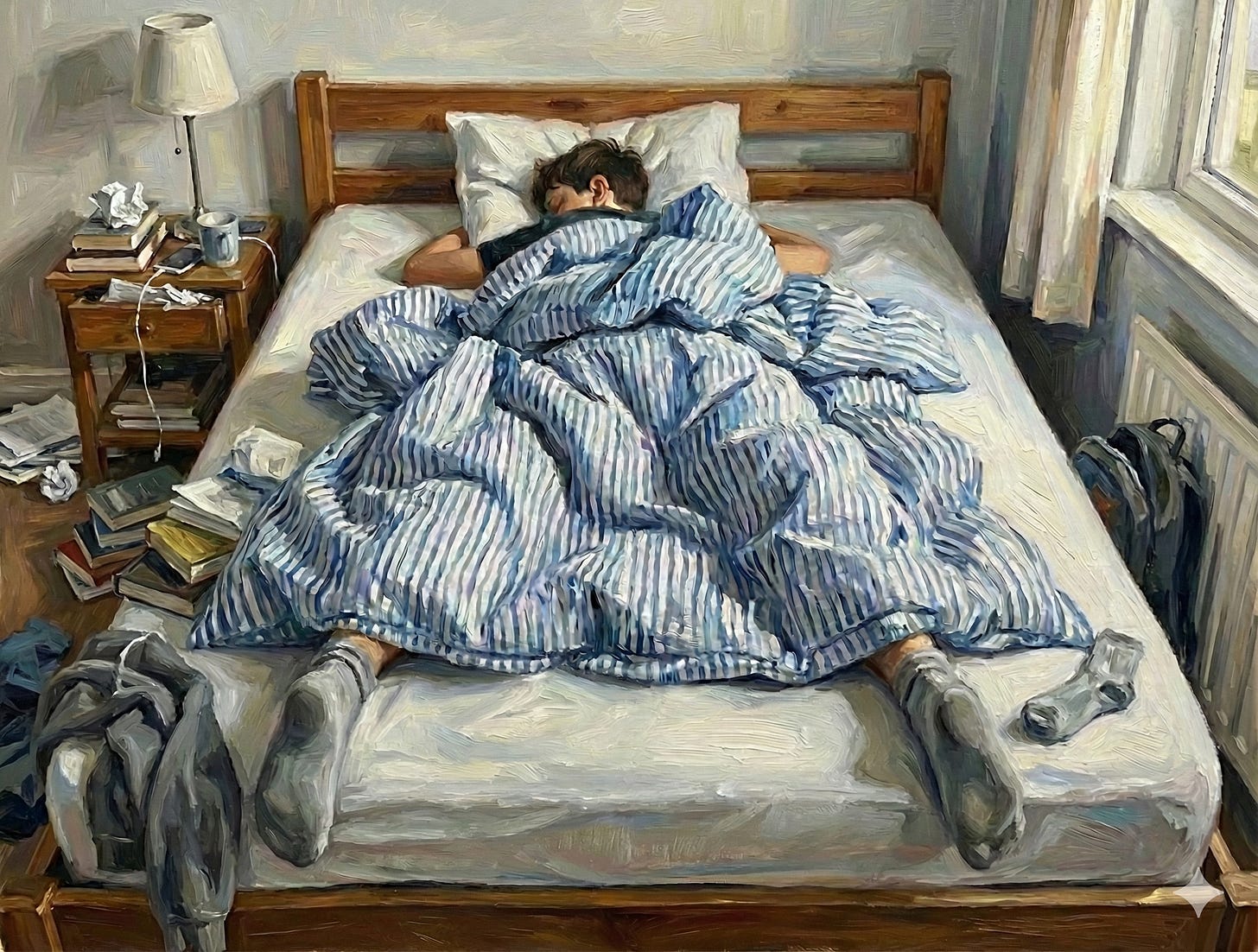 James lay sprawled on his belly, his soft duvet spread over his back as if it were thrown on him rather than carefully placed. His feet—one stretched east, the other other to the west—peeked out the lower borders of his blanket. His blanket felt like a warm, entrancing trap disguised as a hug, enslaving him to sleep.